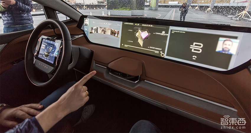 加上地面平坦,甚至還用了木地板裝飾,前排腿部下面由于空調(diào)系統(tǒng)前置、沒有傳統(tǒng)燃油車的變速系統(tǒng),也很空曠,再加上頂部的天窗還未作細(xì)節(jié)是一整塊透明玻璃,整個(gè)BYTON Concept坐進(jìn)去的第一印象就是空間感很敞亮。