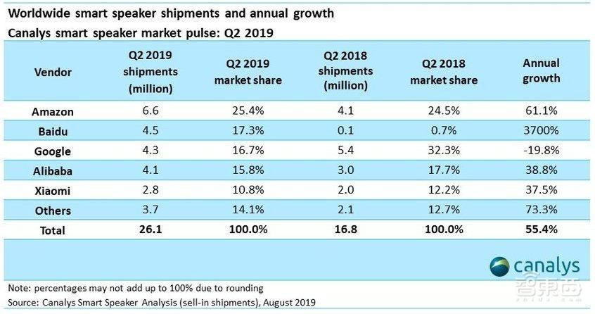 今年8月,行業(yè)研究機(jī)構(gòu)Canalys報告中指出,2019年Q2全球智能音箱出貨2610萬臺,其中百度Q2出貨量同比增長37倍,超越谷歌,成為世界第二大智能音箱生產(chǎn)商,僅次于亞馬遜。