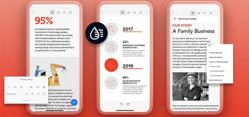 目前,“液體模式”在iOS和Android的免費(fèi)Adobe Acrobat Reader應(yīng)用程序中已經(jīng)可以使用,此外也支持在Google Play商店的Chromebook上使用,未來還將會實(shí)現(xiàn)在臺式機(jī)和瀏覽器上的應(yīng)用。