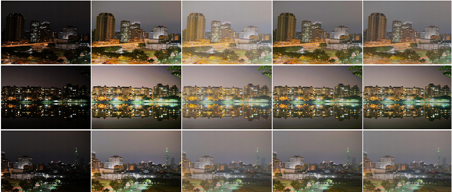 具體操作是研究人員首先使用線性化網(wǎng)絡(luò)估計(jì)輸入夜間圖像的逆條件隨機(jī)場(chǎng)(CRF),獲得線性化圖像后,將其分解為低頻(光場(chǎng),LF,包含輝光、眩光效果)和高頻(同態(tài)濾波,HF,包含噪聲、紋理等效果)特征圖。光場(chǎng)特征圖和同態(tài)濾波特征圖使用訓(xùn)練得到的兩個(gè)網(wǎng)絡(luò)來(lái),分別抑制光效應(yīng)和去除噪聲。最后將處理過(guò)的光場(chǎng)特征圖和同態(tài)濾波特征圖融合并輸出。