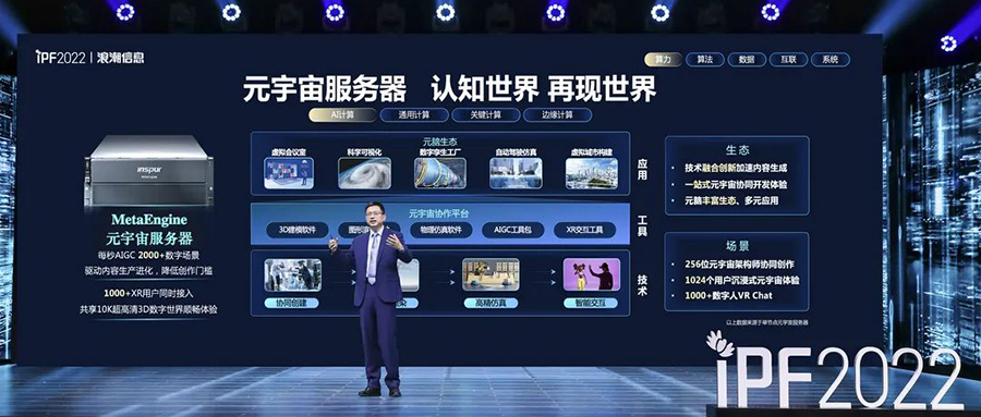 面向AI計(jì)算及元宇宙應(yīng)用,彭震宣布推出浪潮元宇宙服務(wù)器MetaEngine,目標(biāo)是構(gòu)建軟硬一體化基礎(chǔ)設(shè)施,服務(wù)于大規(guī)模、高復(fù)雜、高逼真數(shù)字場景協(xié)同創(chuàng)建和實(shí)時(shí)渲染仿真。