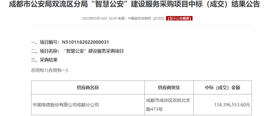智東西5月17日?qǐng)?bào)道,昨日晚間,成都市公安局雙流區(qū)分局“智慧公安”建設(shè)服務(wù)采購(gòu)項(xiàng)目公布中標(biāo)結(jié)果,中國(guó)電信成都分公司中標(biāo),金額約為1.34億元。