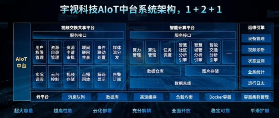 本次,宇視升級其AIoT中臺架構,并發(fā)布全分布式視頻交換共享平臺。整個AIoT中臺架構“1+2+1”四部分組成: