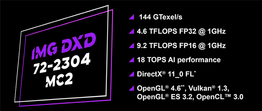 IMG DXD雙核配置可提供144GTexel/s填充率,可滿足主流游戲玩家對(duì)流暢幀速率的需求,并能夠提供4.6TFLOPS FP32、9.2TFLOPS FP16浮點(diǎn)算力、18TOPS AI性能。