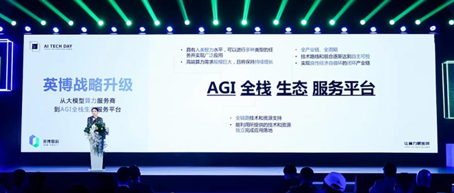 這場大會上,英博數(shù)科正式宣布戰(zhàn)略升級,從1.0階段定位大模型算力服務(wù)商,升級到2.0定位“AGI全棧生態(tài)服務(wù)平臺”——為AGI全產(chǎn)業(yè)鏈客戶提供充足穩(wěn)定的算力和全棧式解決方案。