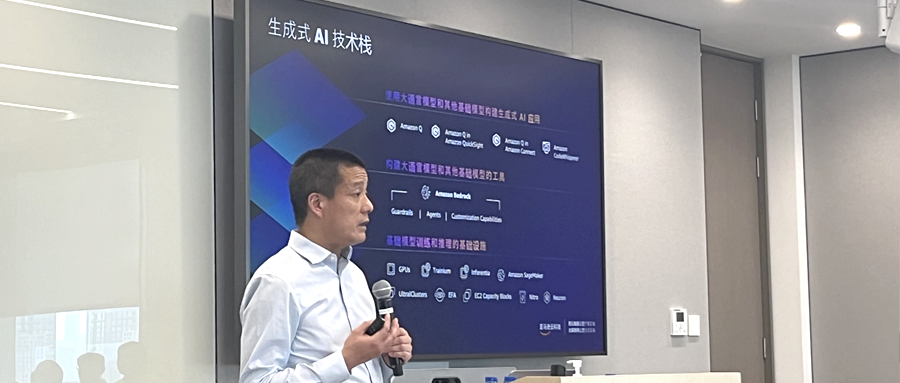 陳曉建首先解讀了AWS的生成式AI技術(shù)棧。目前,AWS在基礎(chǔ)設(shè)施層面提供GPUs、自研Trainium芯片、Nitro系統(tǒng)等底層設(shè)施,在大模型構(gòu)建工具層面提供大模型托管平臺(tái)Amazon Bedrock,在應(yīng)用層面則推出了智能助手Amazon Q、代碼助手Amazon CodeWhisperer等。