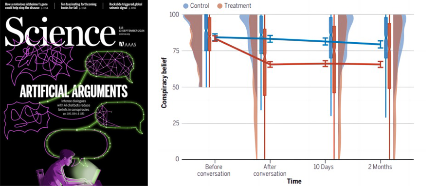 AI大模型擊碎陰謀論!登上Science封面,用聊天戳破謠言漏洞▲與AI對話能持久降低陰謀論可信度,即使是堅(jiān)定的陰謀論者也不例外。對話后參與者對所選陰謀論的平均信任度降低,效果持續(xù)兩個月。(圖源:Science)