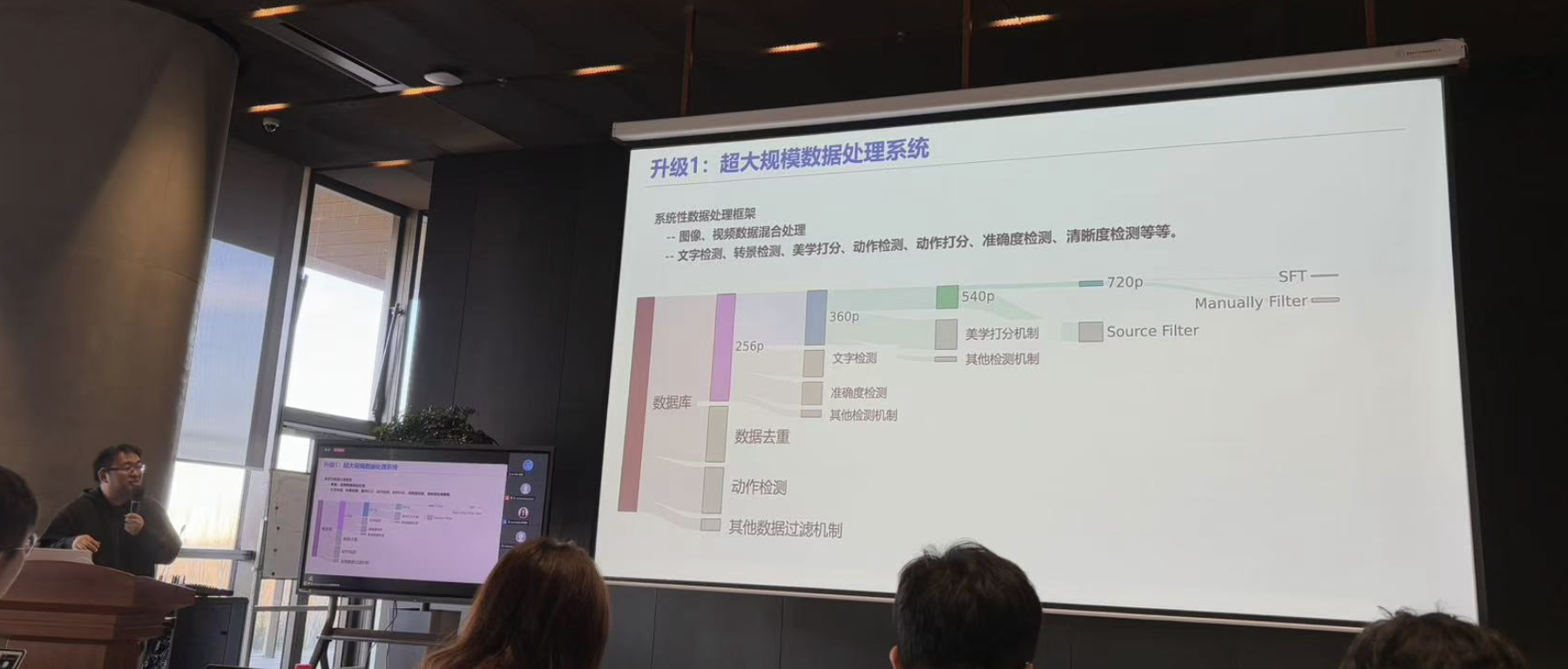 首先,模型采用了一個超大規(guī)模的數(shù)據(jù)處理系統(tǒng),能夠混合處理圖像與視頻數(shù)據(jù)。該系統(tǒng)包括文字檢測、轉(zhuǎn)景檢測、美學打分、動作檢測、準確度檢測等多個維度的功能,進一步提升視頻畫質(zhì)。