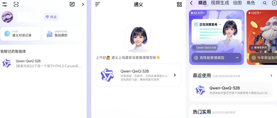 此外,通義首頁還會推薦基于其他模型或者具備其他不同功能的智能體。目前,基于Qwen-QwQ-32B的被放在了首頁的推薦欄中。用戶只需點擊,就能與這款新模型進行對話。