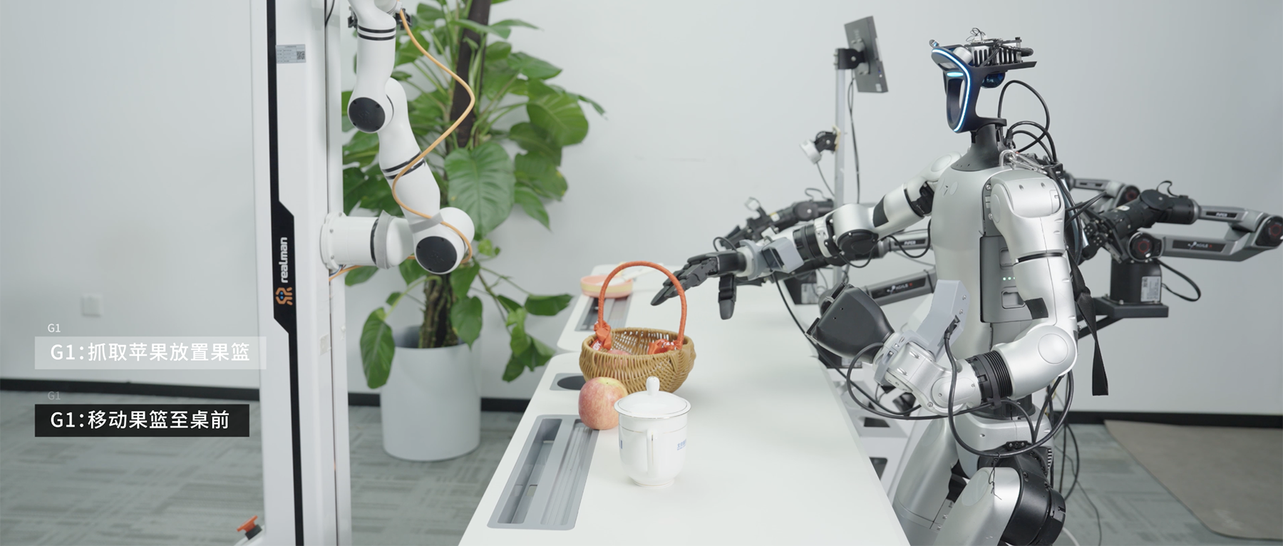 在“遞送蘋果和水果刀”的任務(wù)場(chǎng)景中,基于RoboOS及RoboBrain,睿爾曼單臂機(jī)器人(轉(zhuǎn)運(yùn))、宇樹人形G1(挑揀水果)、松靈雙臂機(jī)器人(挑揀水果刀)分工協(xié)作。