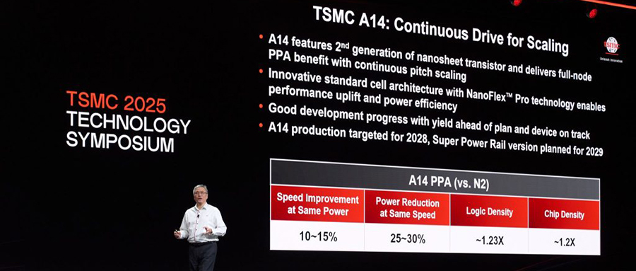 芯東西4月24日?qǐng)?bào)道,臺(tái)積電今日在北美技術(shù)研討會(huì)上發(fā)布了其下一代前沿邏輯工藝技術(shù)A14(1.4nm)。A14計(jì)劃于2028年投產(chǎn),開(kāi)發(fā)進(jìn)展順利,良率表現(xiàn)優(yōu)于預(yù)期進(jìn)度,支持背面供電的升級(jí)版A14將在2029年推出。
