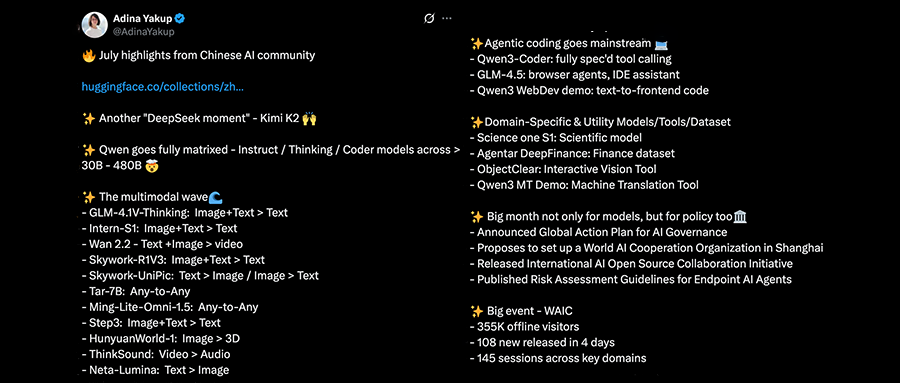 Hugging Face還在周五發(fā)布了中國AI社區(qū)7月重點,回溯這一個月來令人眼花繚亂的開源浪潮,包括: