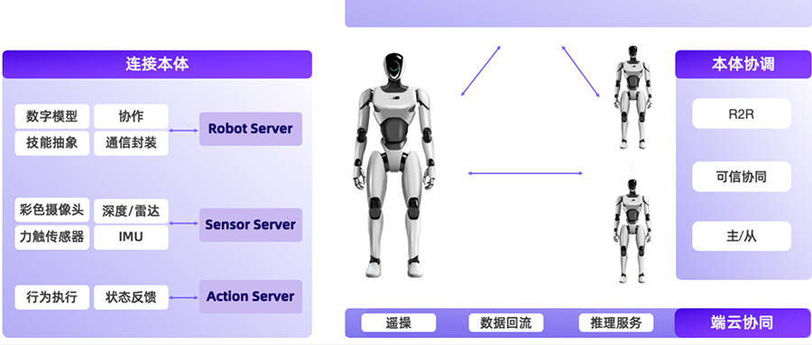 RCP目前實(shí)現(xiàn)的主要功能包括:提供機(jī)器人本體及相關(guān)傳感器能力的抽象,對(duì)外提供各種功能,并通過(guò)標(biāo)準(zhǔn)協(xié)議、不同的傳輸層和模型服務(wù)進(jìn)行交互;RobotMotion作為云端推理與機(jī)器人本體控制之間的橋梁,將離散的低頻推理命令實(shí)時(shí)轉(zhuǎn)換為高頻的連續(xù)控制信號(hào),驅(qū)動(dòng)機(jī)器人完成運(yùn)動(dòng)任務(wù)。此外,它還配備了運(yùn)動(dòng)規(guī)劃與控制所需的工具包,助力具身智能融入物理世界。