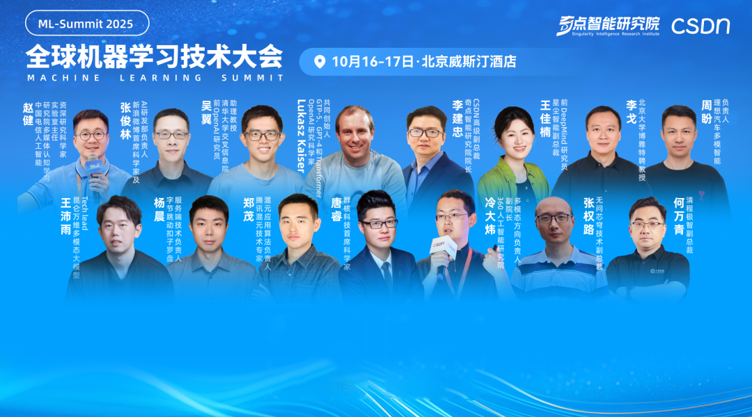 正是在這種歷史周期的加速交替與范式轉(zhuǎn)換背景下,由 CSDN 與奇點(diǎn)智能研究院聯(lián)合舉辦的 2025 全球機(jī)器學(xué)習(xí)技術(shù)大會(huì)將于 10 月 16–17 日在北京威斯汀酒店召開(kāi),屆時(shí)全球頂級(jí)學(xué)者與產(chǎn)業(yè)領(lǐng)袖將齊聚一堂。在這里,我們將不再僅僅停留在對(duì)未來(lái)的想象,而是與 50 余位頂尖專家一道,深度剖析這些核心命題,共同探索 AI 時(shí)代的無(wú)限可能。