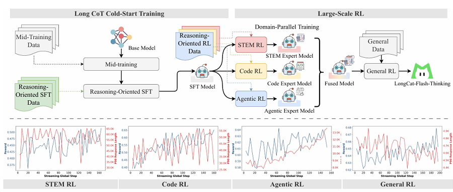 LongCat-Flash-Thinking是在LongCat-Flash的基礎上訓練而來的,經歷了推理增強的中期訓練(Mid-training)面向推理的有監(jiān)督微調(SFT)。
