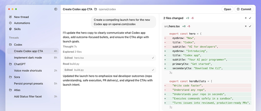 智能體可以在按項(xiàng)目組織的獨(dú)立線程中運(yùn)行,因此開發(fā)者可以在不丟失上下文的情況下無縫切換任務(wù)。該應(yīng)用允許開發(fā)者在線程中查看智能體的更改,對(duì)差異進(jìn)行評(píng)論,甚至可以在編輯器中打開它以進(jìn)行手動(dòng)更改。